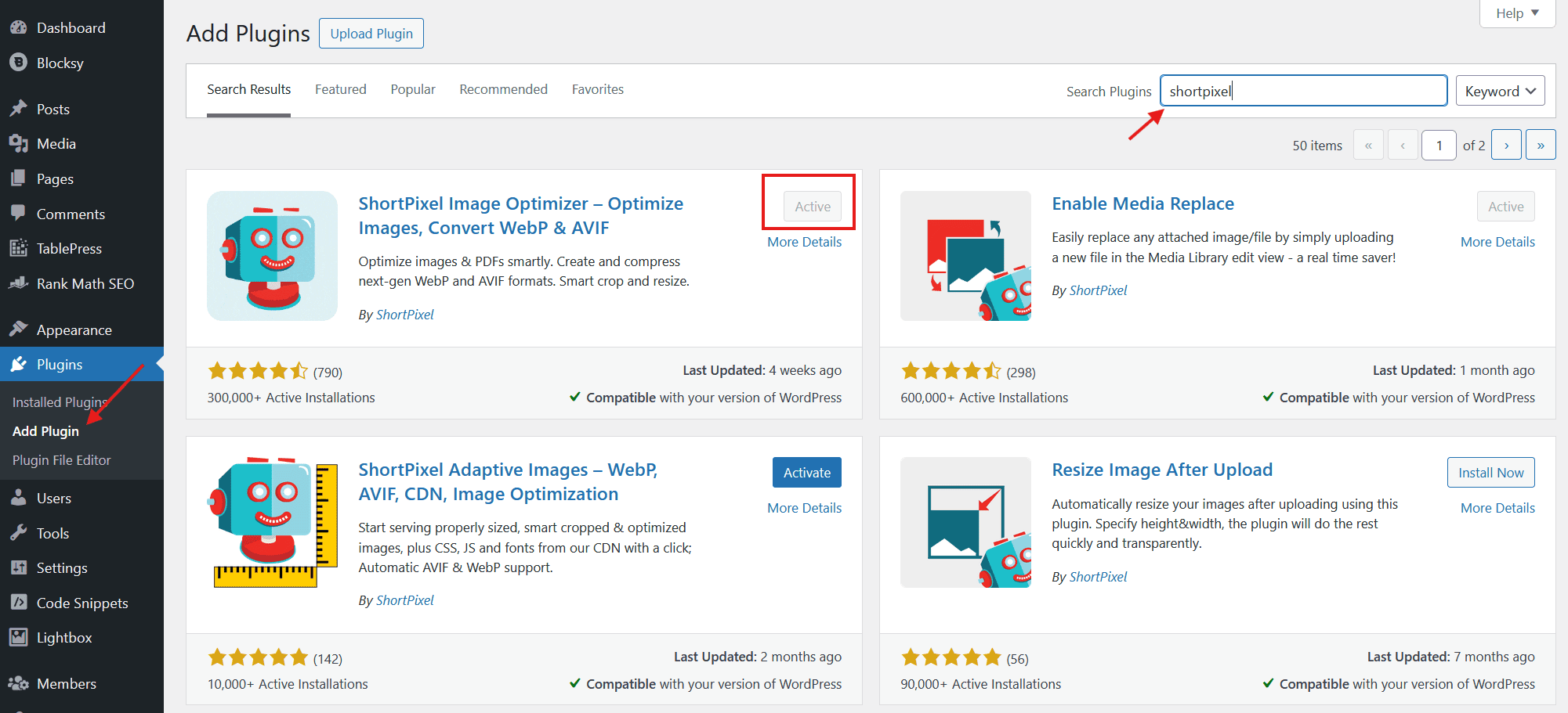 If you’re using WordPress, simply go to Plugins > Add Plugin, search for ShortPixel, and install ShortPixel Image Optimizer.