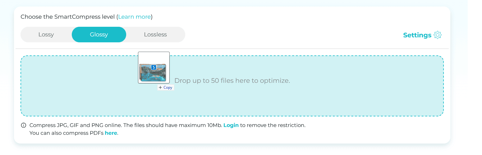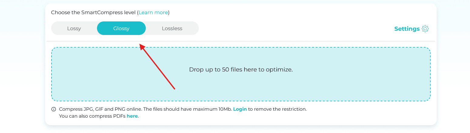 Select your preferred compression level at the top of the page. If you’re unsure, Glossy is a safe bet that delivers excellent results for most use cases.