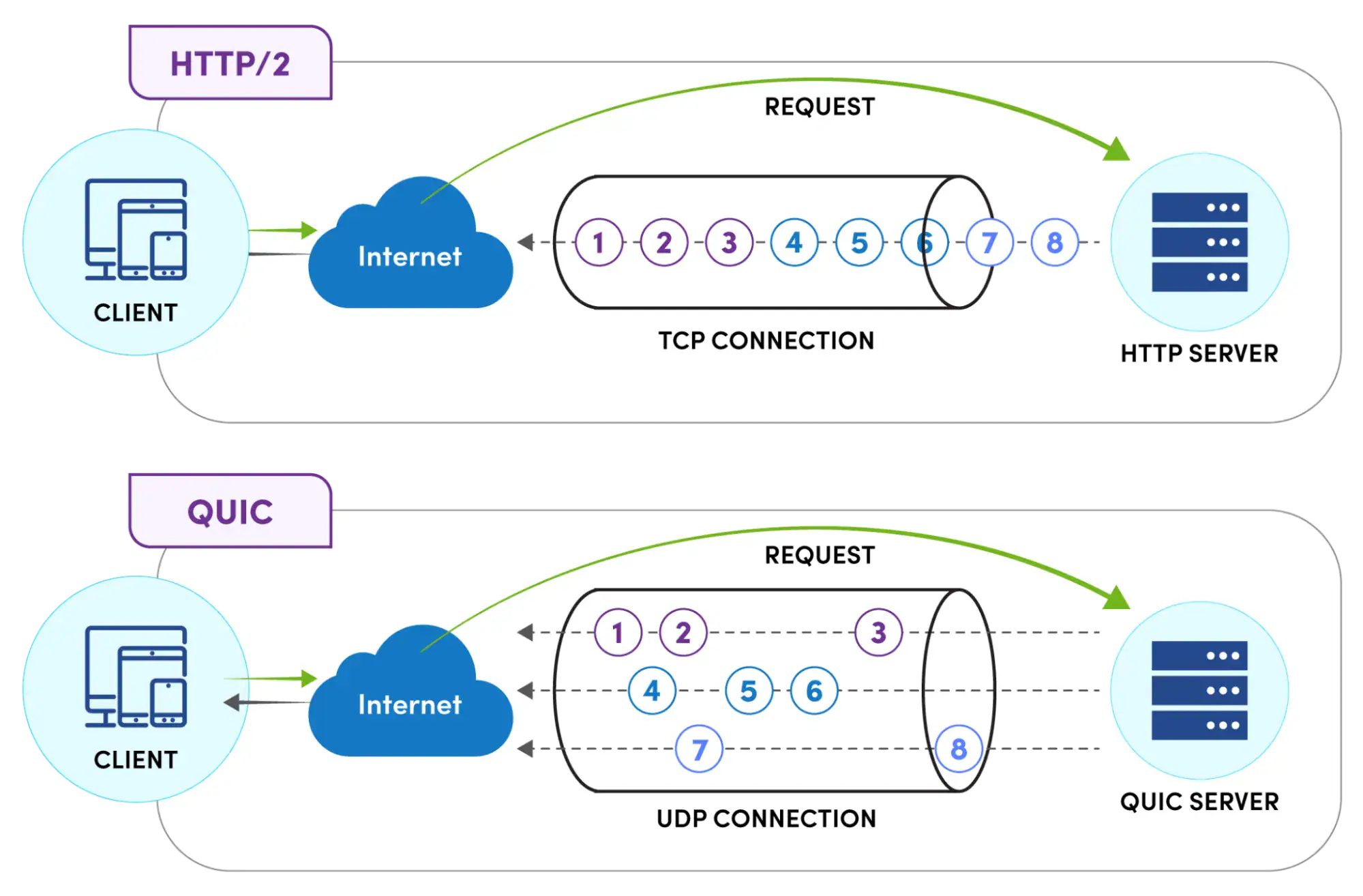 Mobile users on the move. Phones switch between WiFi and cellular constantly. Under HTTP/2, that network switch kills the connection and forces everything to restart. QUIC handles it differently, the session migrates with the network change. No restart needed.