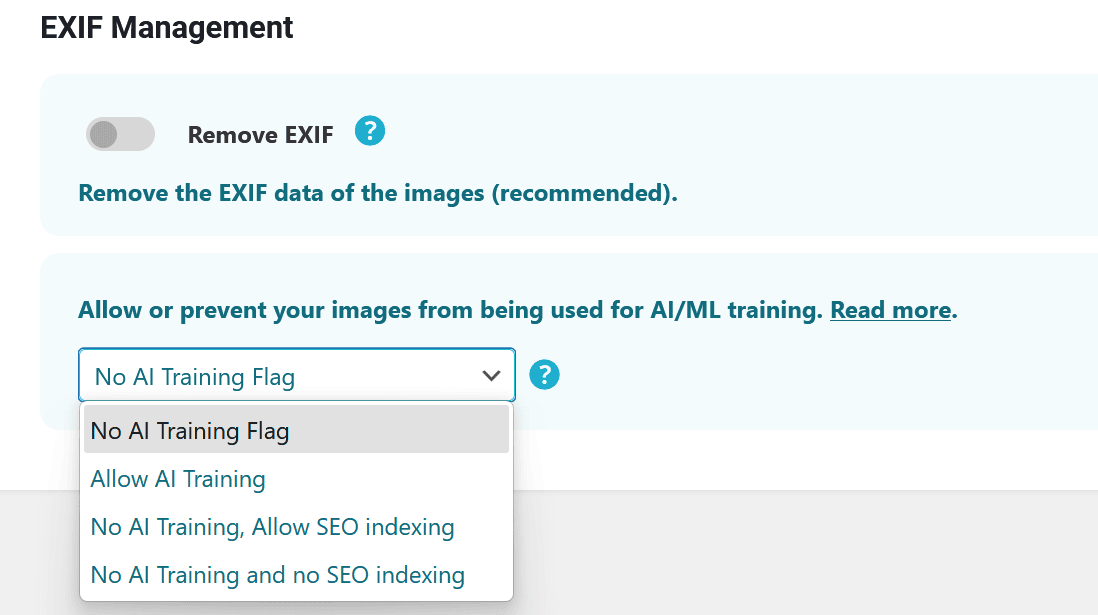 In the plugin settings (Settings > ShortPixel > Image Optimization > EXIF Management), you’ll find an option that lets you decide how your images can be used for AI/ML training.