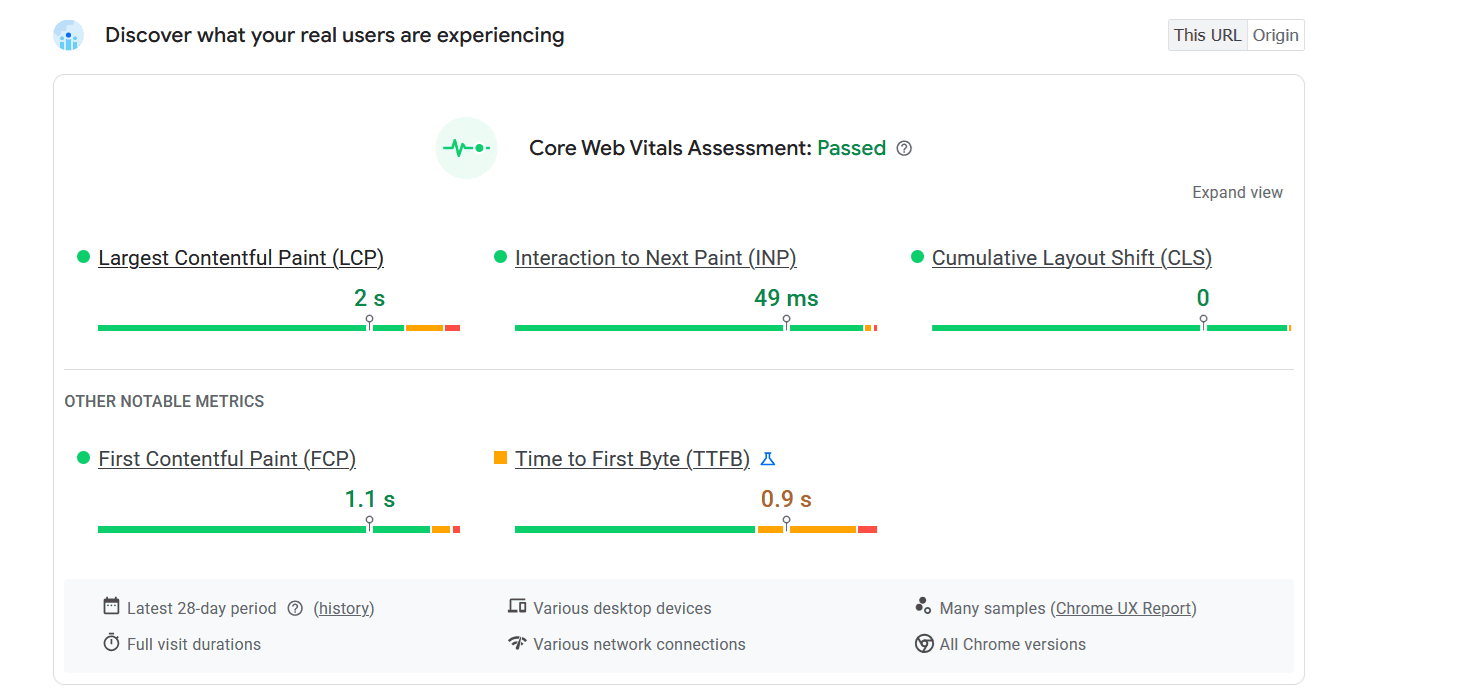 - Interaction to Next Paint (INP): Measures interactivity and responsiveness. Your goal is under 200 milliseconds, ensuring a smooth user experience when they click or navigate.